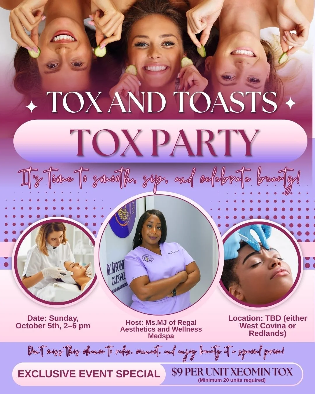Tox and Toasts Tox Party 🥂 📅 COMING SOON!! | 🕑 TBA📍 Location TBD Hosted by Regal Aesthetics and Wellness Medspa